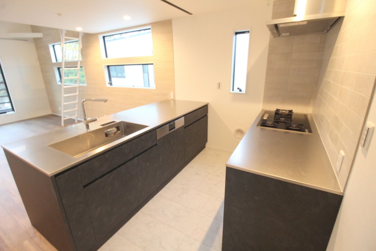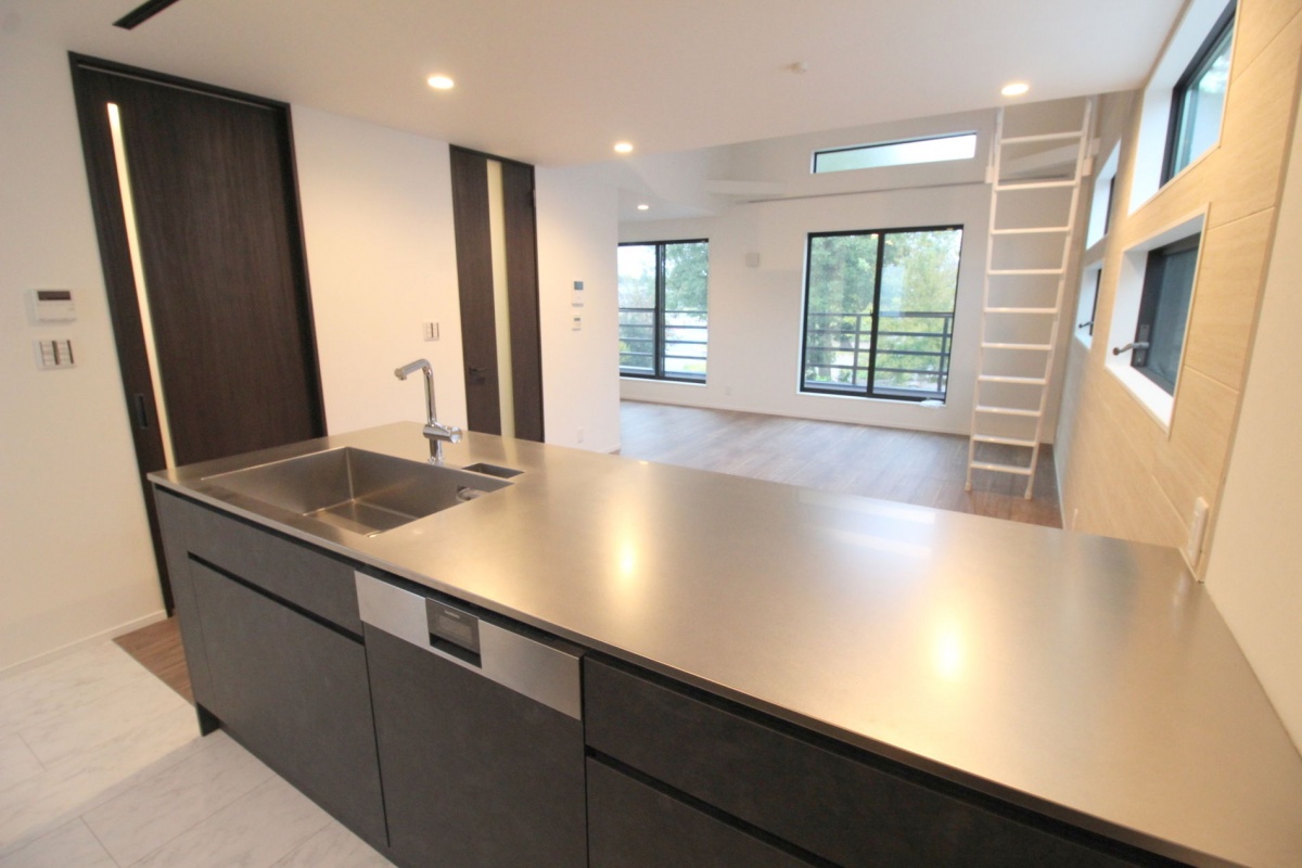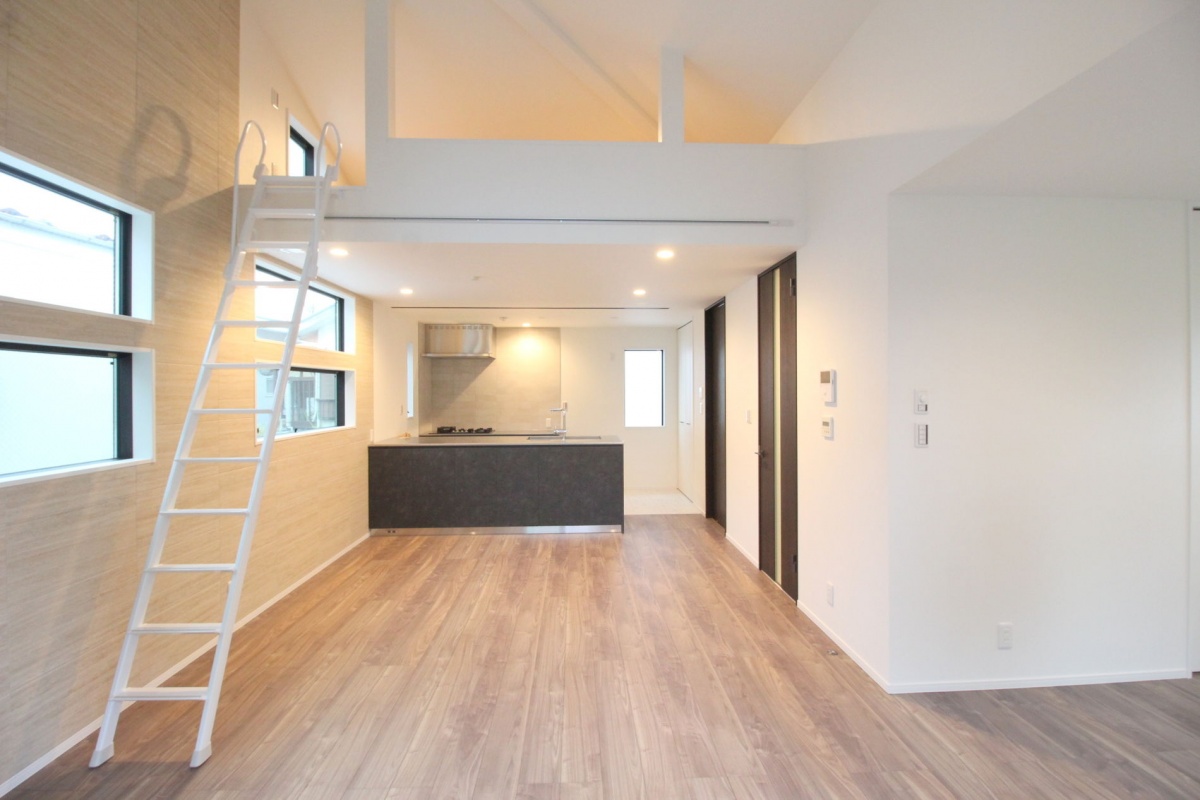 開放的な吹抜けのLDKには、作業スペースが広く、家事動線のよい魅力的な2型キッチンを採用。