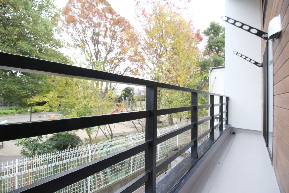 東向きの大きく開口したバルコニーからは、隣接する区立公園の広大な3haの敷地の先に